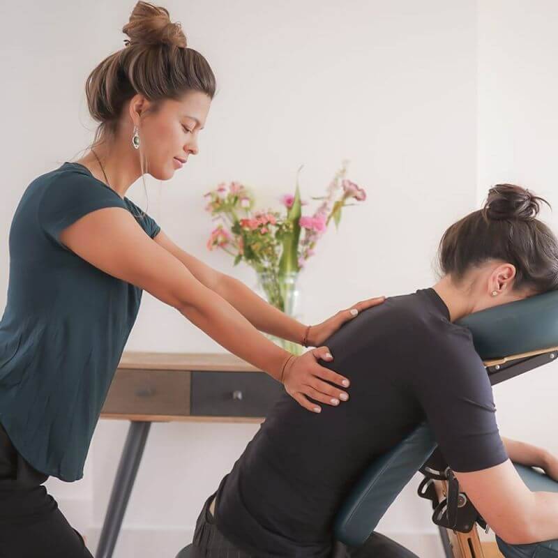 Bij stoelmassage wordt de spanning in de nek, schouders en rug aangepakt met het loskneden van de spieren en met acupressuur (druk op acupunctuurpunten). Na deze korte tijd is de doorbloeding helemaal in orde. Er wordt nadien afgesloten met stretchings om de mobiliteit te verbeteren.